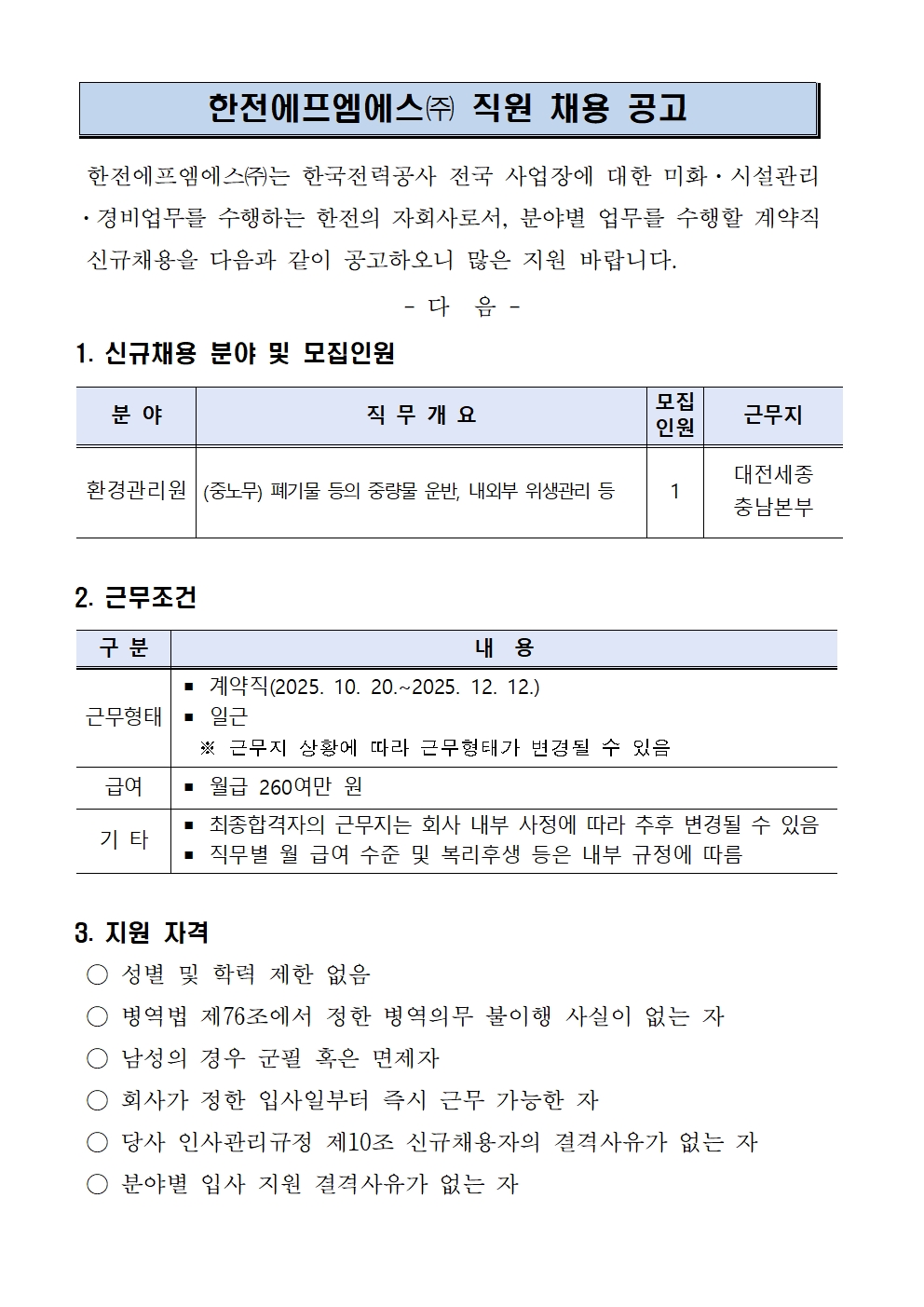 (충청) 대전세종충남본부 환경관리원(중노무) 단기계약직 채용 공고