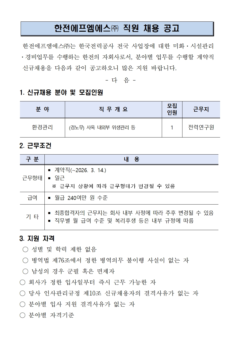 (충청) 전력연구원 환경관리(경노무원) 단기계약직 채용 공고