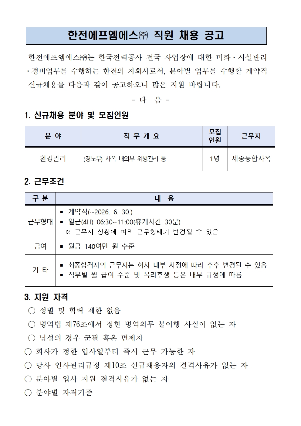 (충청) 세종통합사옥 환경관리(경노무) 단시간근로자 단기계약직 채용 공고