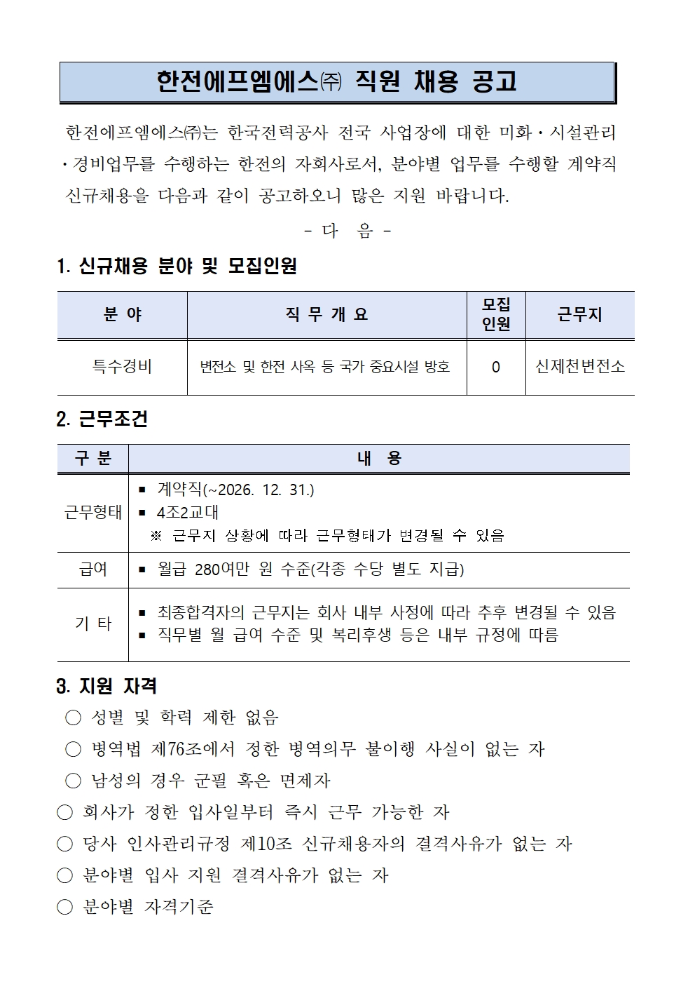 (충청) 신중부변전소 특수경비 단기계약직 채용 공고
