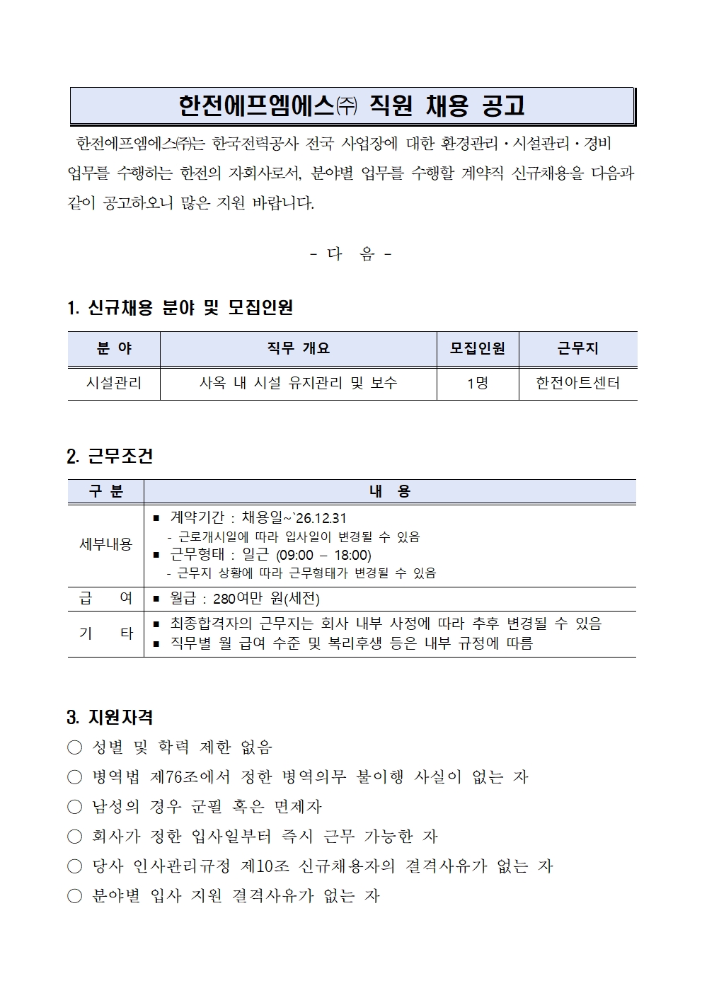 (호남) 한전본사 시설관리 계약직 채용공고2