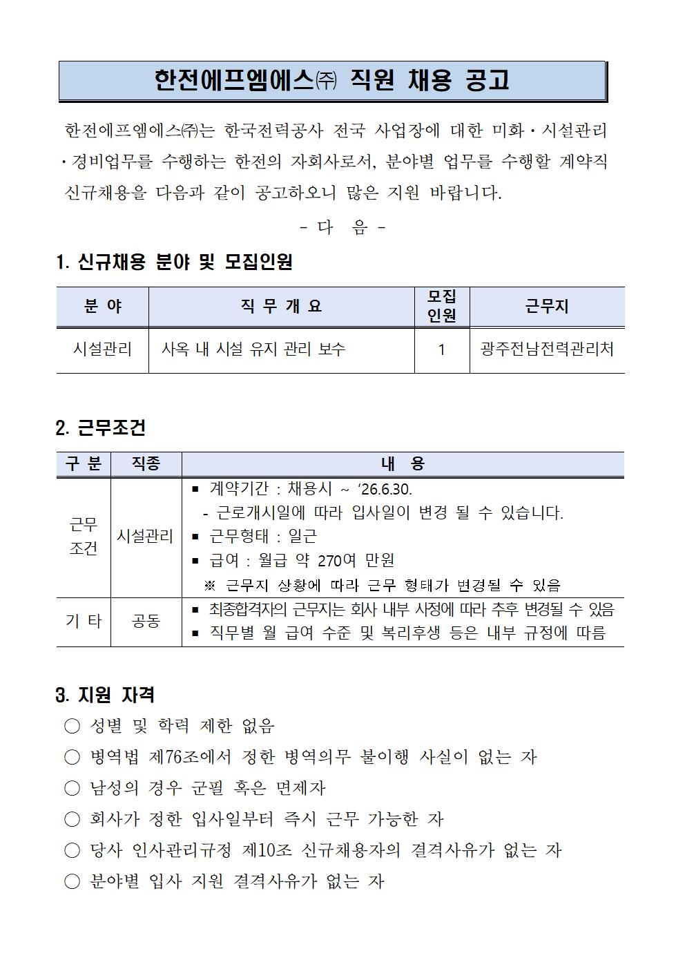 (호남) 광주전남전력관리처 시설 계약직 채용 공고