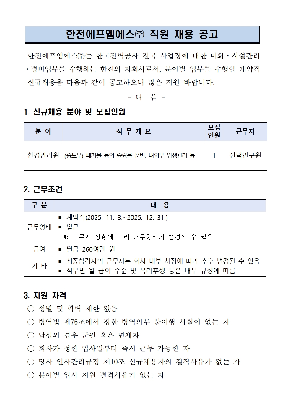 (충청) 전력연구원 환경관리(중노무) 단기계약직 채용 공고